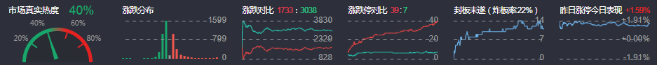 3、两市共1733只个股上涨,39只个股涨停,3038只个股下跌,7只个股跌停,8只股票炸板,炸板率22%。