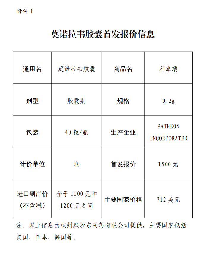 天津市医药采购中心公示,新冠治疗药品莫诺拉韦胶囊首发报价1500元,主要国家价格712美元。 风险提示及免责条款 市场有风险,投资需谨慎。本文不构成个人投资建议,也未考虑到个别用户特殊的投资目标、财务状况或需要。用户应考虑本文中的任何意见、观点或结论是否符合其特定状况。据此投资,责任自负。
