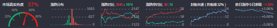 3、两市共2845只个股上涨,38只个股涨停,1874只个股下跌,10只个股跌停,15只股票炸板,炸板率32%。