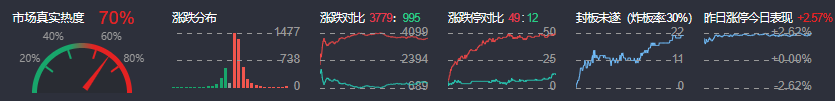 3、两市共3779只个股上涨,49只个股涨停,995只个股下跌,12只个股跌停,20只股票炸板,炸板率30%。