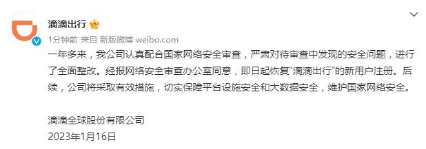 滴滴出行官微发文称,一年多来,公司认真配合国家网络安全审查,严肃对待审查中发现的安全问题,进行了全面整改。经报网络安全审查办公室同意,即日起恢复“滴滴出行”的新用户注册。后续,公司将采取有效措施,切实保障平台设施安全和大数据安全,维护国家网络安全。(证券时报)