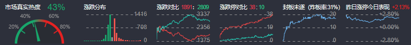 3、两市共1891只个股上涨,38只个股涨停,2809只个股下跌,10只个股跌停,13只股票炸板,炸板率31%。