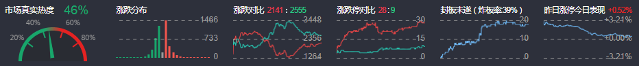 3、两市共2141只个股上涨,28只个股涨停,2555只个股下跌,9只个股跌停,15只股票炸板,炸板率39%。