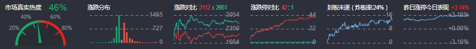 3、两市共2112只个股上涨,42只个股涨停,2651只个股下跌,1只个股跌停,10只股票炸板,炸板率24%。