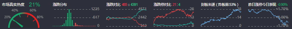 3、两市共485只个股上涨,21只个股涨停,4391只个股下跌,4只个股跌停,21只股票炸板,炸板率53%。