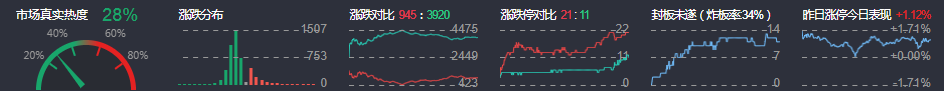 3、两市共945只个股上涨,21只个股涨停,3920只个股下跌,11只个股跌停,10只股票炸板,炸板率34%。