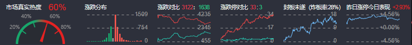 3、两市共3122只个股上涨,33只个股涨停,1638只个股下跌,3只个股跌停,10只股票炸板,炸板率28%。