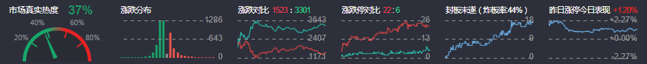 3、两市共1523只个股上涨,22只个股涨停,3301只个股下跌,6只个股跌停,15只股票炸板,炸板率44%。