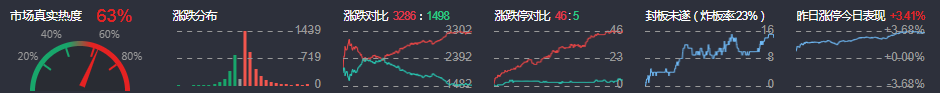 3、两市共3286只个股上涨,46只个股涨停,1498只个股下跌,5只个股跌停,10只股票炸板,炸板率23%。