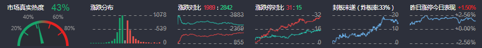 3、两市共1989只个股上涨,31只个股涨停,2842只个股下跌,15只个股跌停,12只股票炸板,炸板率33%。