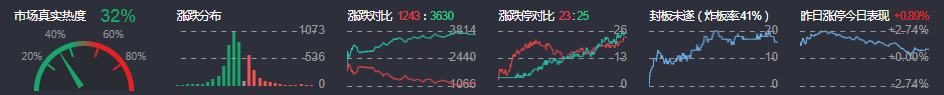 3、两市共1243只个股上涨,23只个股涨停,3630只个股下跌,25只个股跌停,12只股票炸板,炸板率41%。