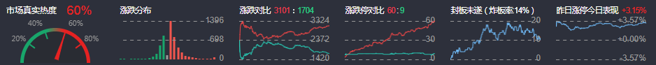 3、两市共3101只个股上涨,60只个股涨停,1704只个股下跌,9只个股跌停,9只股票炸板,炸板率14%。