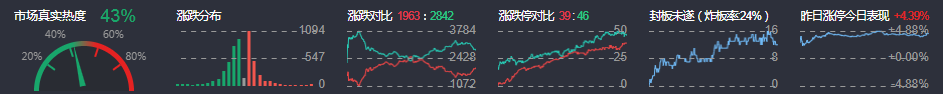 3、两市共1963只个股上涨,39只个股涨停,2842只个股下跌,46只个股跌停,9只股票炸板,炸板率24%。