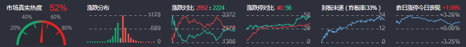 3、两市共2552只个股上涨,40只个股涨停,2224只个股下跌,56只个股跌停,15只股票炸板,炸板率33%。