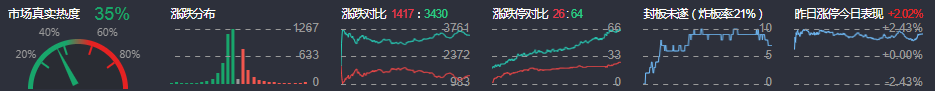 3、两市共1417只个股上涨,26只个股涨停,3430只个股下跌,64只个股跌停,5只股票炸板,炸板率21%。