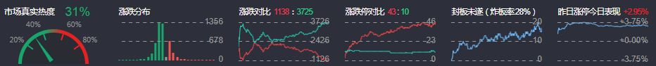 3、两市共1138只个股上涨,43只个股涨停,3725只个股下跌,10只个股跌停,10只股票炸板,炸板率28%。