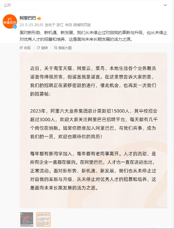 阿里巴巴:网传裁员为谣言,今年预估新招15000人 25日,阿里巴巴集团官方微博宣布,2023年六大业务集团总计需新招15000人,其中校招超过3000人。同时表示,“近日,关于淘宝天猫、阿里云、菜鸟、本地生活各个业务裁员谣言传得很厉害,但谣言就是谣言。我们的招聘正在紧锣密鼓的进行。” 风险提示及免责条款 市场有风险,投资需谨慎。本文不构成个人投资建议,也未考虑到个别用户特殊的投资目标、财务状况或需要。用户应考虑本文中的任何意见、观点或结论是否符合其特定状况。据此投资,责任自负。