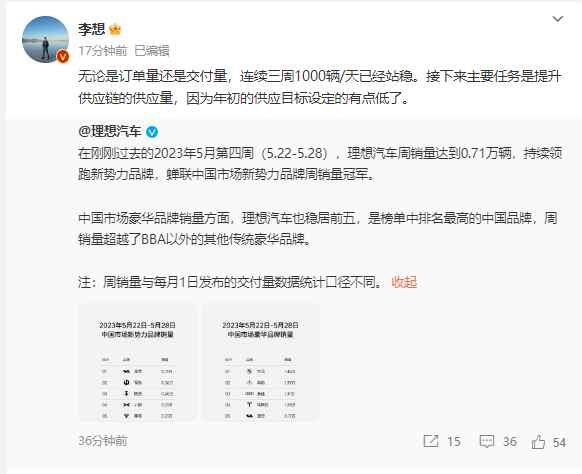 理想汽车CEO李想:无论是订单量还是交付量,连续三周1000辆/天已经站稳。接下来主要任务是提升供应链的供应量,因为年初的供应目标设定的有点低了。 风险提示及免责条款 市场有风险,投资需谨慎。本文不构成个人投资建议,也未考虑到个别用户特殊的投资目标、财务状况或需要。用户应考虑本文中的任何意见、观点或结论是否符合其特定状况。据此投资,责任自负。