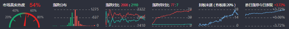 3、两市共2698只个股上涨,77只个股涨停,2110只个股下跌,7只个股跌停,14只股票炸板,炸板率20%。