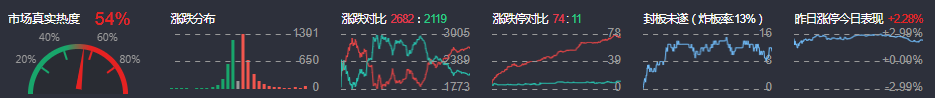 3、两市共2682只个股上涨,74只个股涨停,2119只个股下跌,11只个股跌停,7只股票炸板,炸板率13%。
