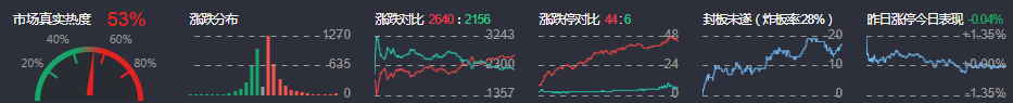 3、两市共2640只个股上涨,44只个股涨停,2156只个股下跌,6只个股跌停,16只股票炸板,炸板率28%。