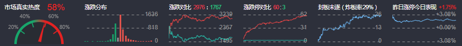 3、两市共2976只个股上涨,60只个股涨停,1768只个股下跌,3只个股跌停,22只股票炸板,炸板率29%。