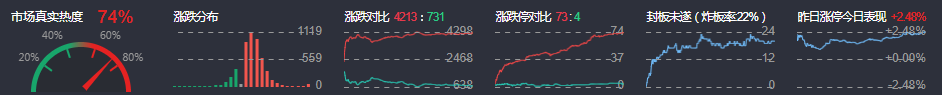 3、两市共4213只个股上涨,73只个股涨停,731只个股下跌,4只个股跌停,17只股票炸板,炸板率22%。