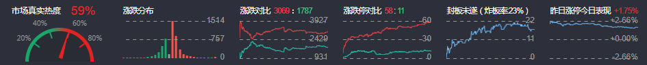 3、两市共3069只个股上涨,58只个股涨停,1787只个股下跌,11只个股跌停,13只股票炸板,炸板率23%。