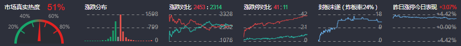 3、两市共2453只个股上涨,41只个股涨停,2314只个股下跌,11只个股跌停,13只股票炸板,炸板率24%。