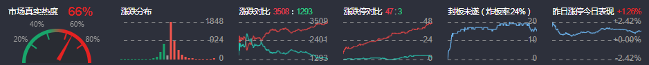 3、两市共3508只个股上涨,47只个股涨停,1293只个股下跌,3只个股跌停,15只股票炸板,炸板率24%。