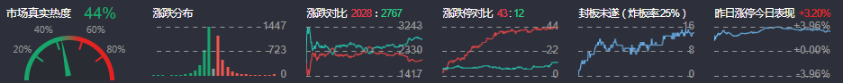 3、两市共2027只个股上涨,43只个股涨停,2768只个股下跌,12只个股跌停,11只股票炸板,炸板率25%。