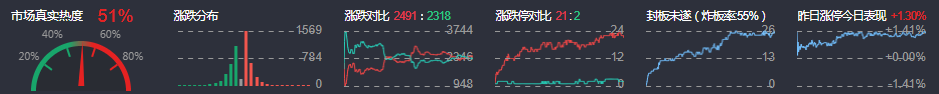 3、两市共2491只个股上涨,21只个股涨停,2318只个股下跌,2只个股跌停,20只股票炸板,炸板率55%。