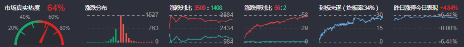 3、两市共3509只个股上涨,56只个股涨停,1408只个股下跌,2只个股跌停,27只股票炸板,炸板率34%。