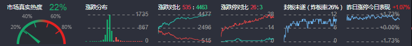 3、两市共535只个股上涨,26只个股涨停,4463只个股下跌,3只个股跌停,5只股票炸板,炸板率26%。