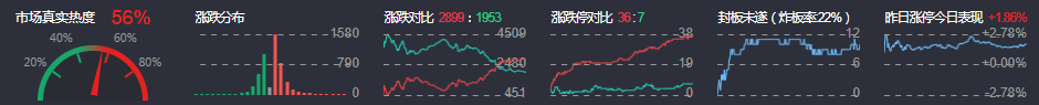 3、两市共2899只个股上涨,36只个股涨停,1953只个股下跌,7只个股跌停,9只股票炸板,炸板率22%。