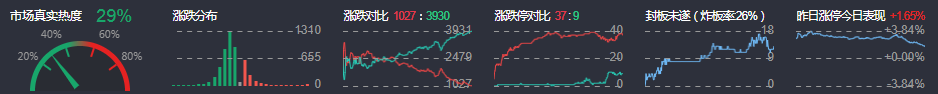 3、两市共1027只个股上涨,37只个股涨停,3930只个股下跌,9只个股跌停,9只股票炸板,炸板率26%。