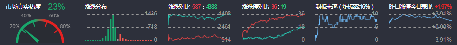 3、两市共587只个股上涨,36只个股涨停,4388只个股下跌,19只个股跌停,6只股票炸板,炸板率16%。