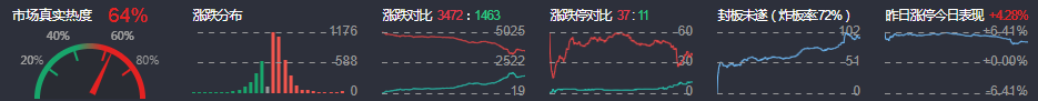3、两市共3472只个股上涨,37只个股涨停,1463只个股下跌,11只个股跌停,88只股票炸板,炸板率72%。