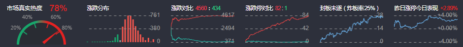 3、两市共4560只个股上涨,82只个股涨停,434只个股下跌,1只个股跌停,24只股票炸板,炸板率25%。