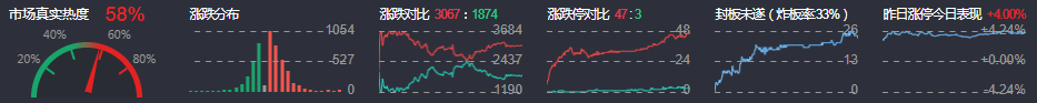 3、两市共3067只个股上涨,47只个股涨停,1874只个股下跌,3只个股跌停,18只股票炸板,炸板率33%。