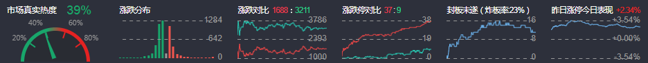 3、两市共1688只个股上涨,37只个股涨停,3211只个股下跌,9只个股跌停,9只股票炸板,炸板率23%。