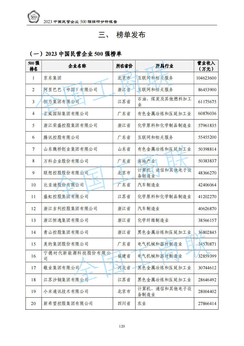 全国工商联9月12日发布“2023中国民营企业500强”榜单和《2023中国民营企业500强调研分析报告》。京东集团、阿里巴巴(中国)有限公司、恒力集团有限公司位居榜单前三位。根据调研分析报告,2022年,民营企业500强入围门槛为275.78亿元,较上年增加12.11亿元。其中,2022年营业收入总额超过1000亿元(含)的企业有95家。据介绍,今年是全国工商联连续组织开展的第25次上规模民营企业调研,共有8961家年营业收入5亿元以上的企业参加。(新华社)