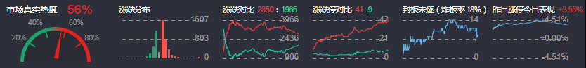 3、两市共2850只个股上涨,41只个股涨停,1965只个股下跌,9只个股跌停,9只股票炸板,炸板率18%。