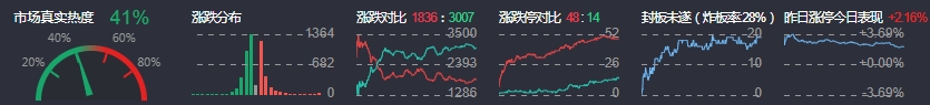3、两市共1836只个股上涨,48只个股涨停,3007只个股下跌,14只个股跌停,11只股票炸板,炸板率28%。