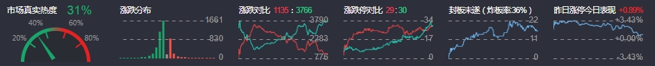 3、两市共1135只个股上涨,29只个股涨停,3766只个股下跌,30只个股跌停,14只股票炸板,炸板率36%。