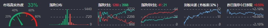3、两市共1280只个股上涨,41只个股涨停,3568只个股下跌,21只个股跌停,16只股票炸板,炸板率32%。