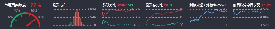 3、两市共4504只个股上涨,68只个股涨停,519只个股下跌,8只个股跌停,19只股票炸板,炸板率26%。