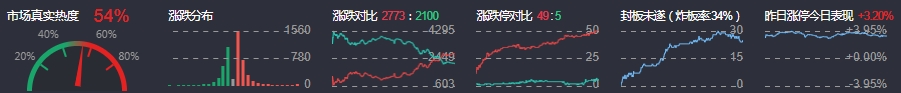 3、两市共2773只个股上涨,49只个股涨停,2100只个股下跌,5只个股跌停,23只股票炸板,炸板率32%。