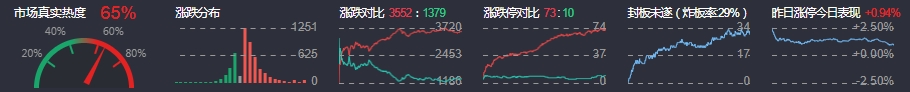 3、两市共3552只个股上涨,73只个股涨停,1379只个股下跌,10只个股跌停,27只股票炸板,炸板率29%。