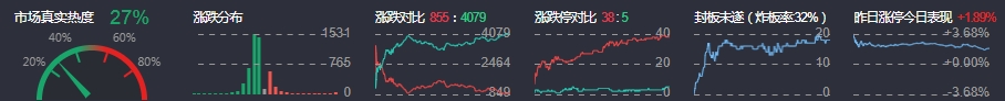 3、两市共855只个股上涨,38只个股涨停,4079只个股下跌,5只个股跌停,13只股票炸板,炸板率32%。